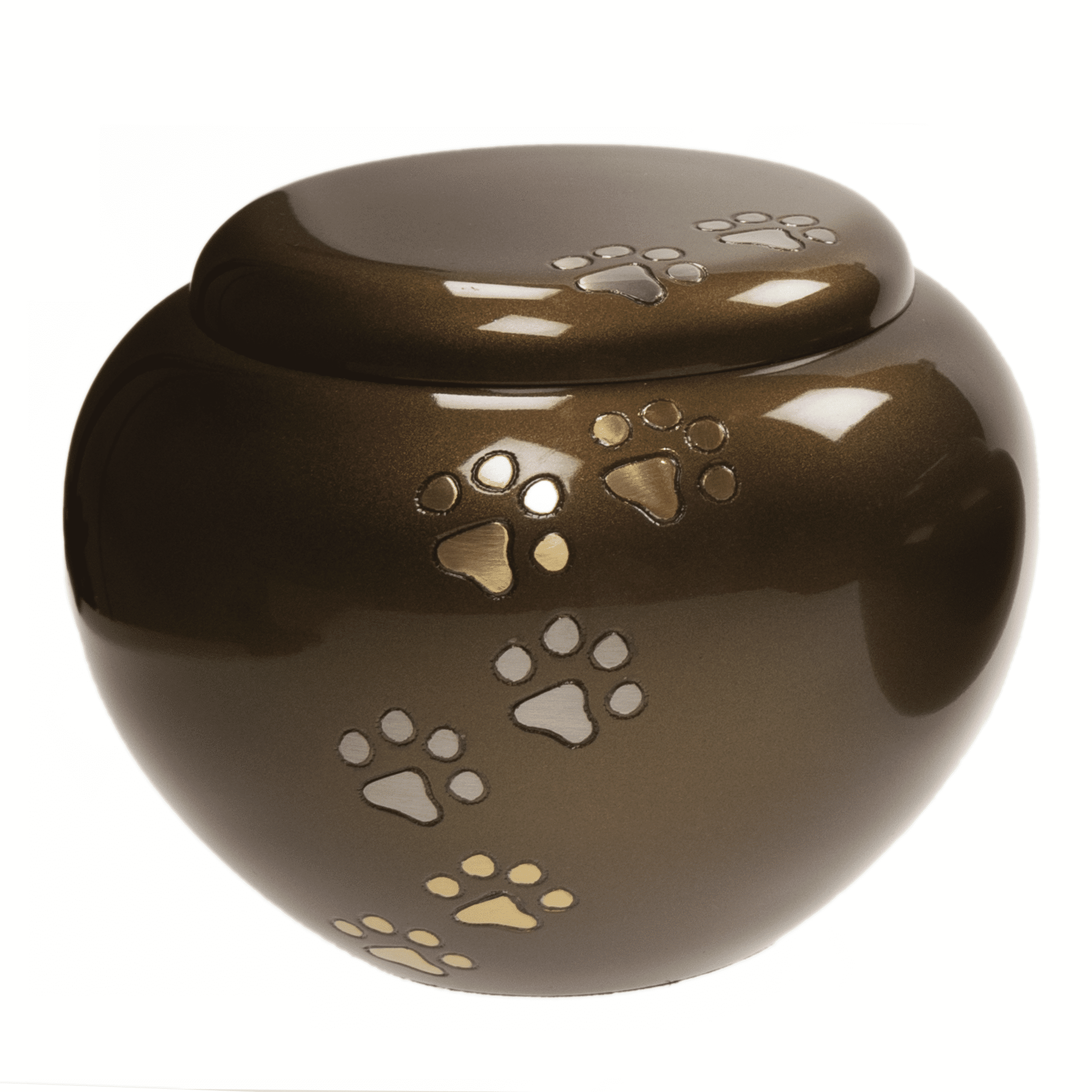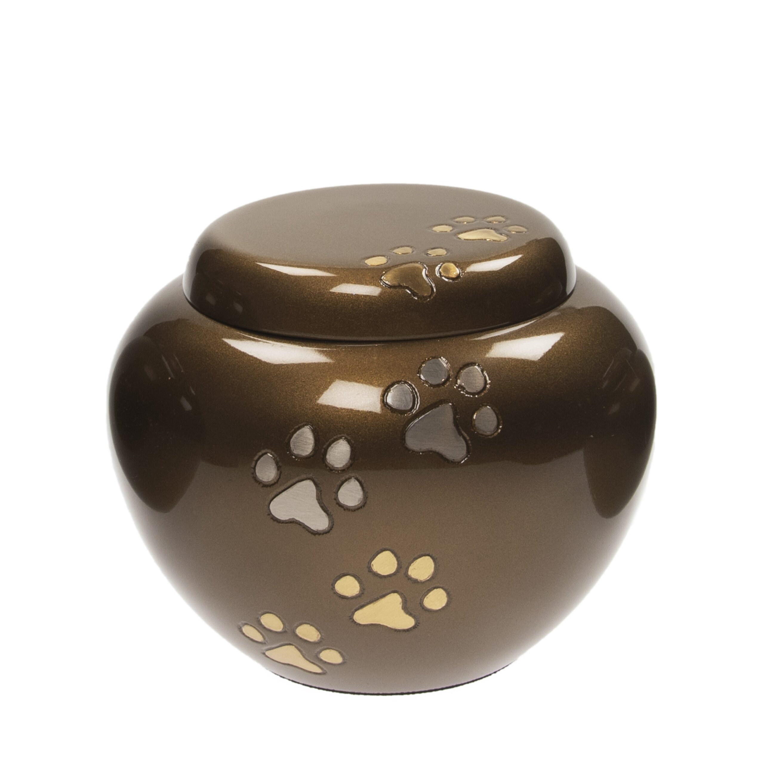 Metalen urne, rond model, brons van kleur met gouden pootjes,