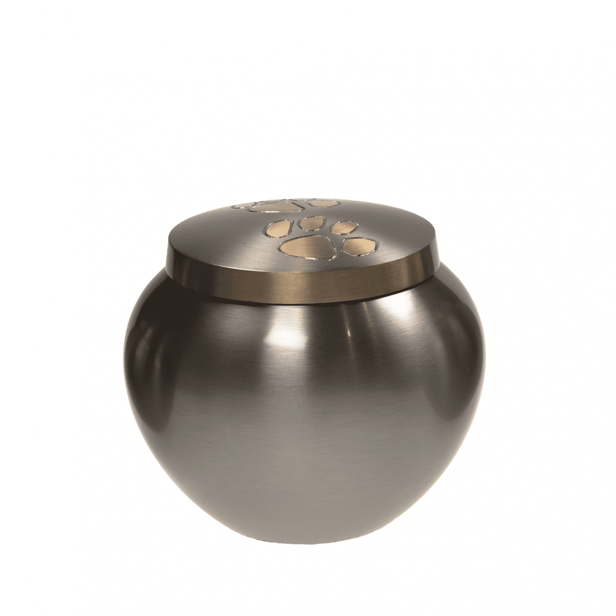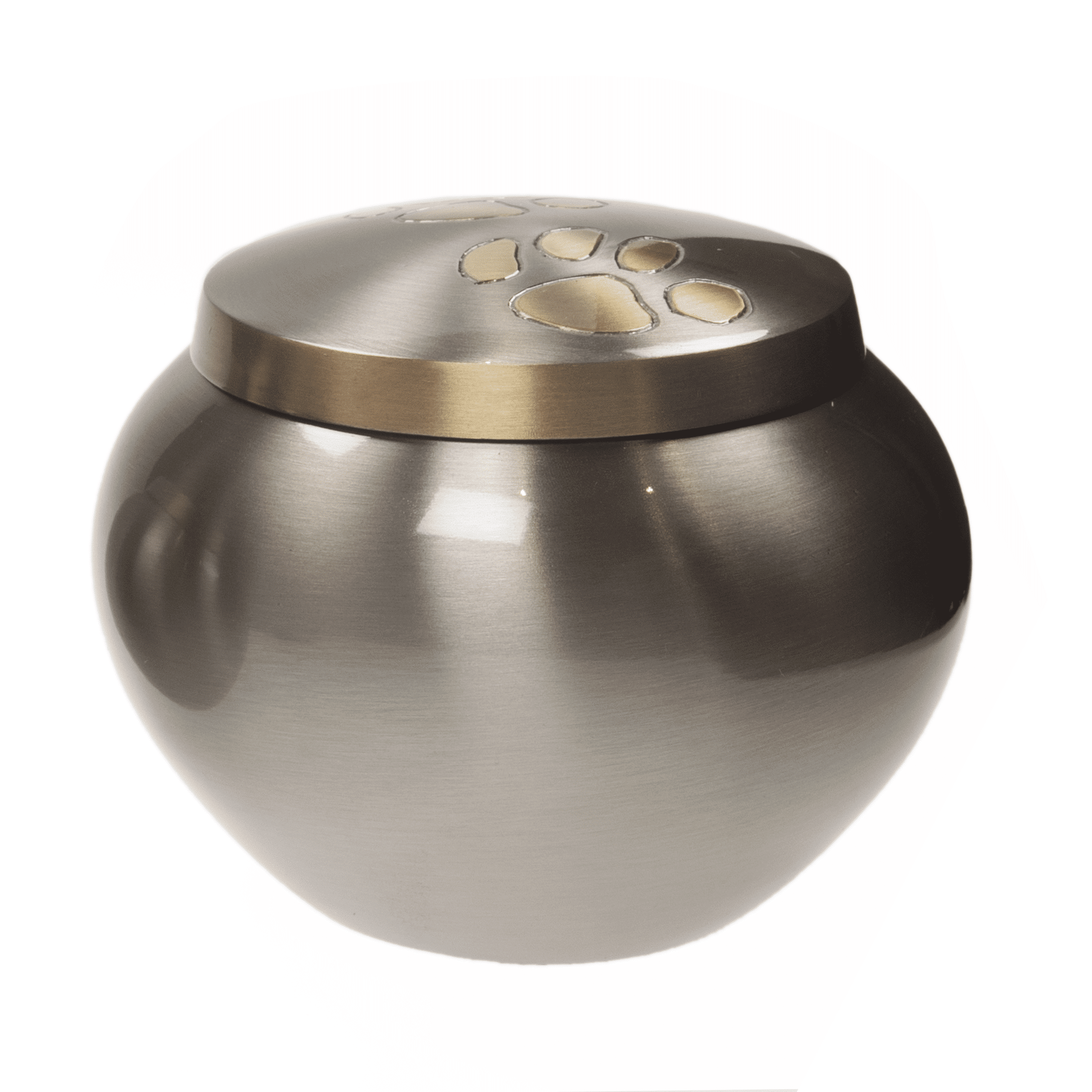 Metalen urne, zilver van kleur met 2 gouden pootjes
